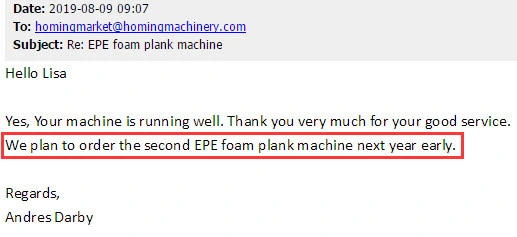 2.) 4 workers in total for the complete process from material feeding to the EPE foam board curing;